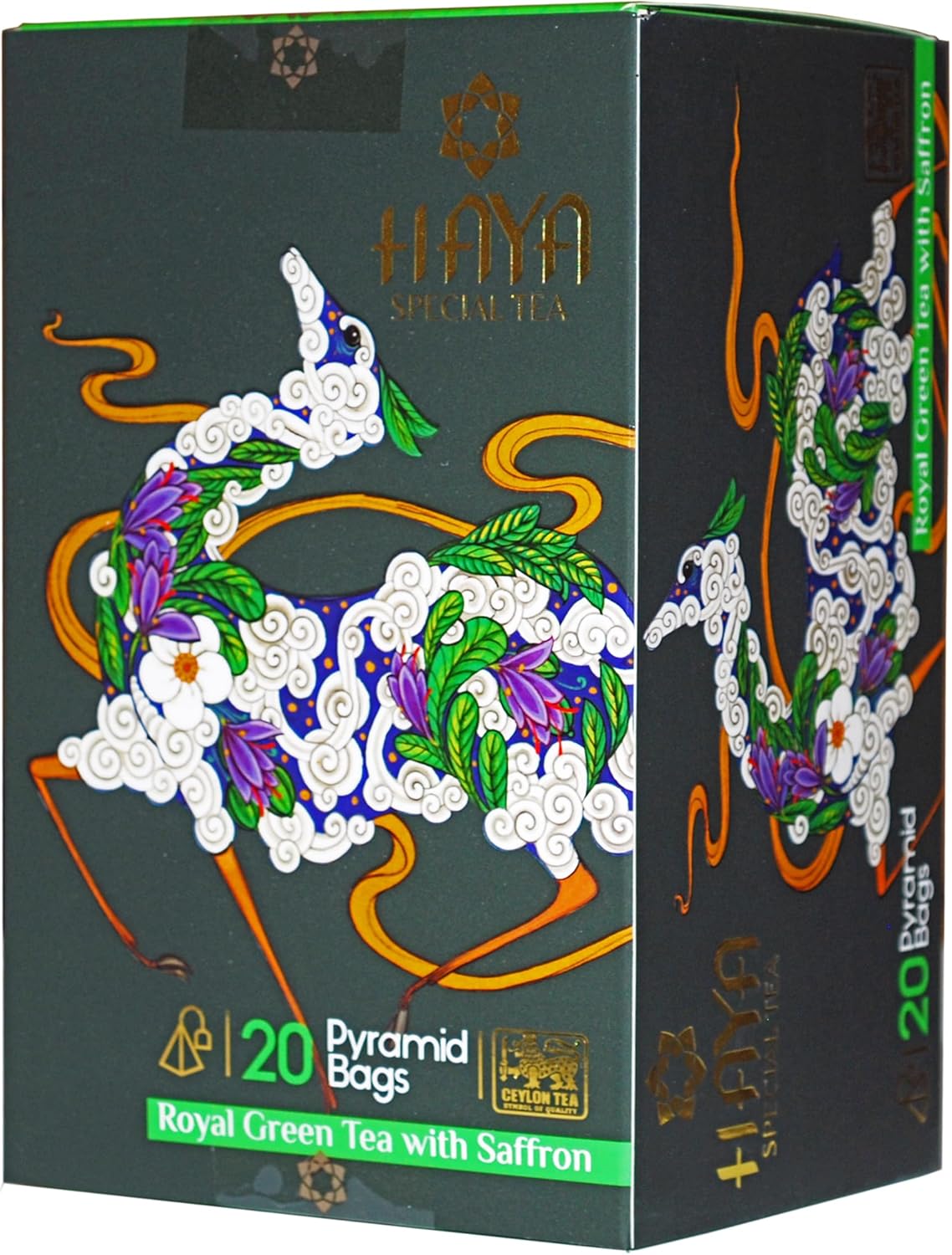 Haya Royal Green Tea with Saffron – 20 Pyramid Tea Bags Individually Wrapped for Fresh Aroma & Flavor